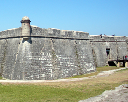 As forts go, the castillo is tiny. But it was enough to secure Spanish dominion over Florida for 236 years. (Indeed, it will not be until the year 2057 that St. Augustine will have been an American city for as long as it was a Spanish city.) The fort was originally covered with a brilliant white plaster and the towers at the corners were painted scarlet. The red-and-white motif symbolized the Spanish flag and told all who passed by that the fort was still in Spanish hands.